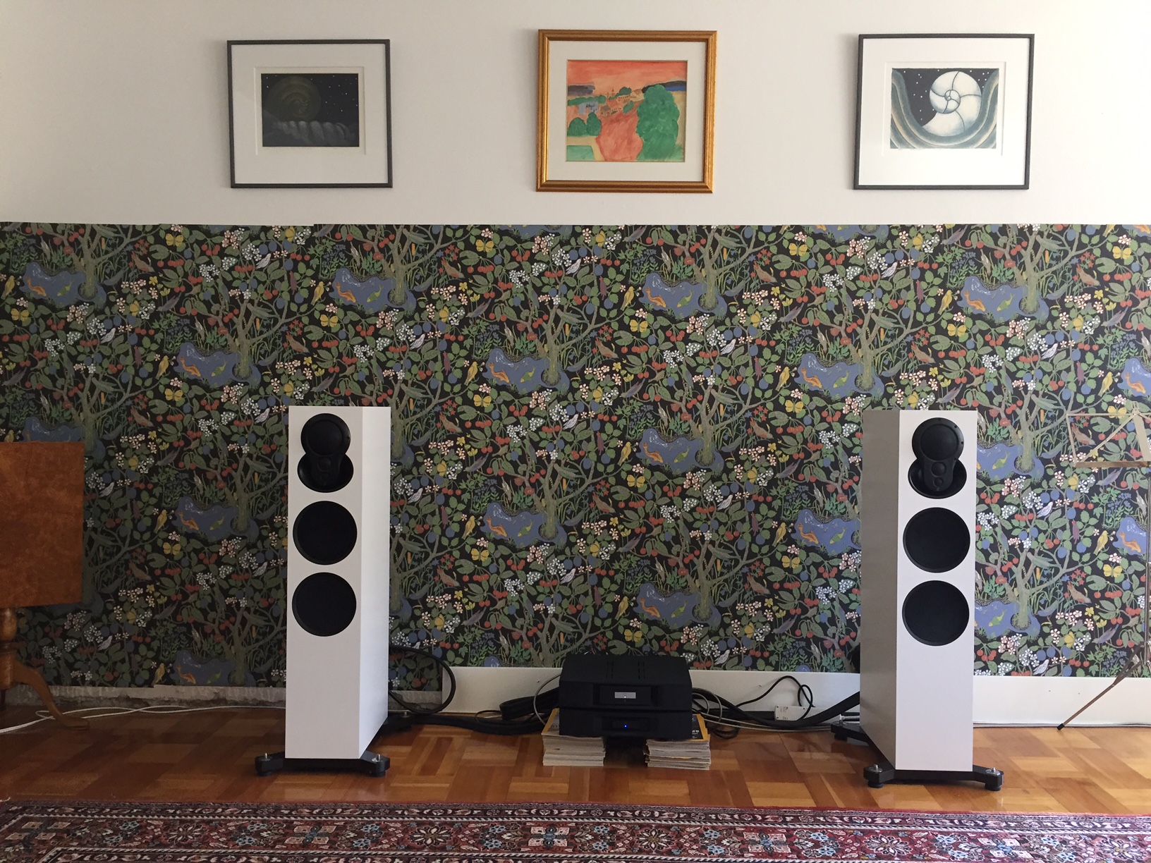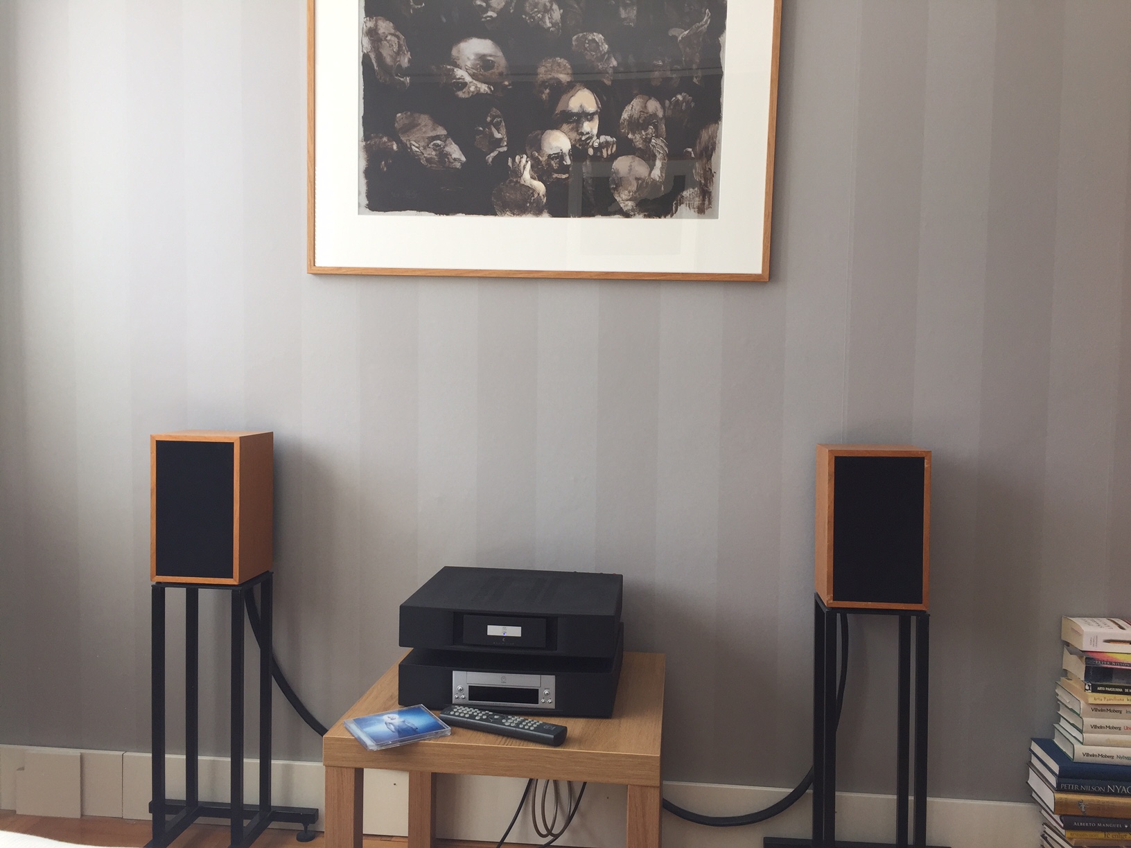 Vardagsrummet är lite knöligt, med vägg åt vänster i bilden och åt höger en dörröppning m dubbeldörrar. Placeringen är intrimmad så bra den går och rumskorrigerad av Anton & co så med mindre än att jag gör om rummet så blir det inte bättre. Båda anläggningarna är hursom roliga att lyssna på... och väldigt olika