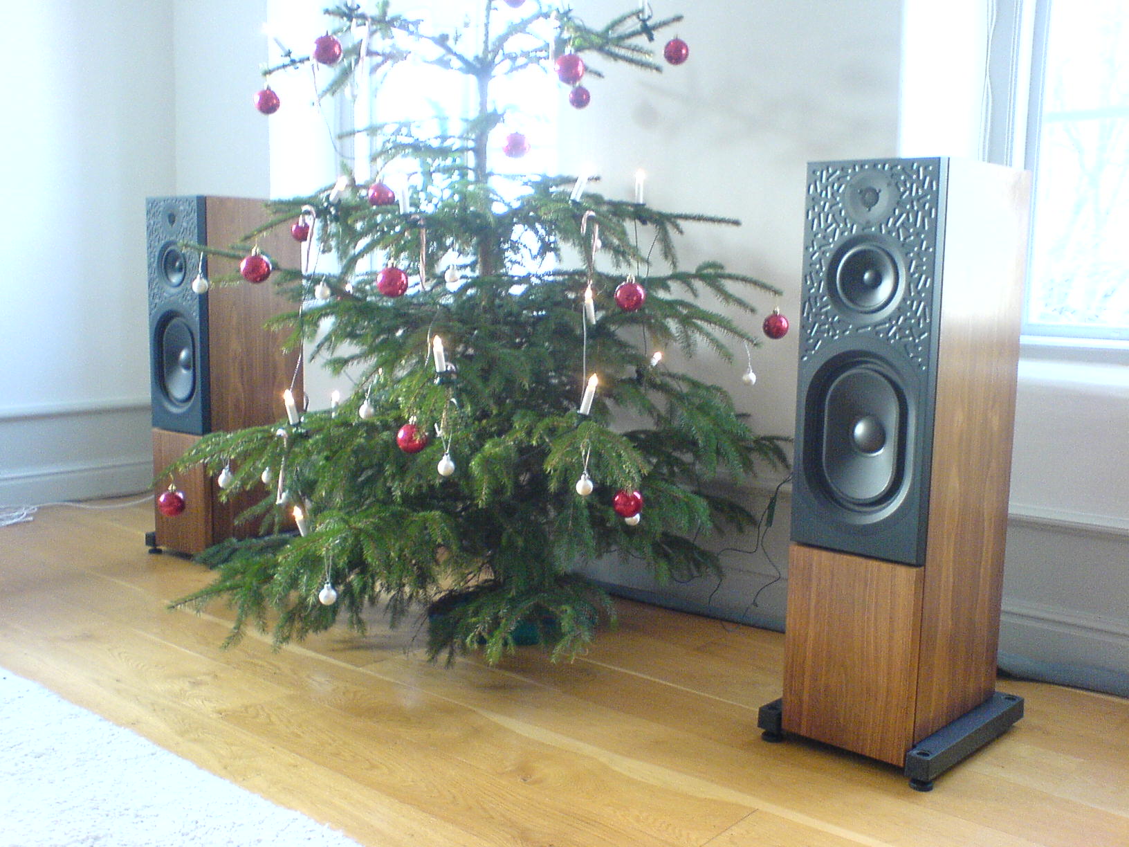 Annandag jul var familjerna hemflugna och jag skred direkt till verket. Ut med filterna till Keilidh från Kloutarna och in med nya. Pilligt, men alltid lika läckert att se insidan av Kloutarna! Splittade ännu en K400 och drog den igenom min "kabelstrumpa". Ut med Keilidh från v-rummet och sen släpade jag bokstavligt talat in Keltikarna i v-rummet mha en handduk under resp högtalarfot. PUST! In med en högtalare på respektive sida om den stolta granen. Upp på 3 spikes med Skeets i våg och sen återstod "bara" inkopplandet av alla kablar.