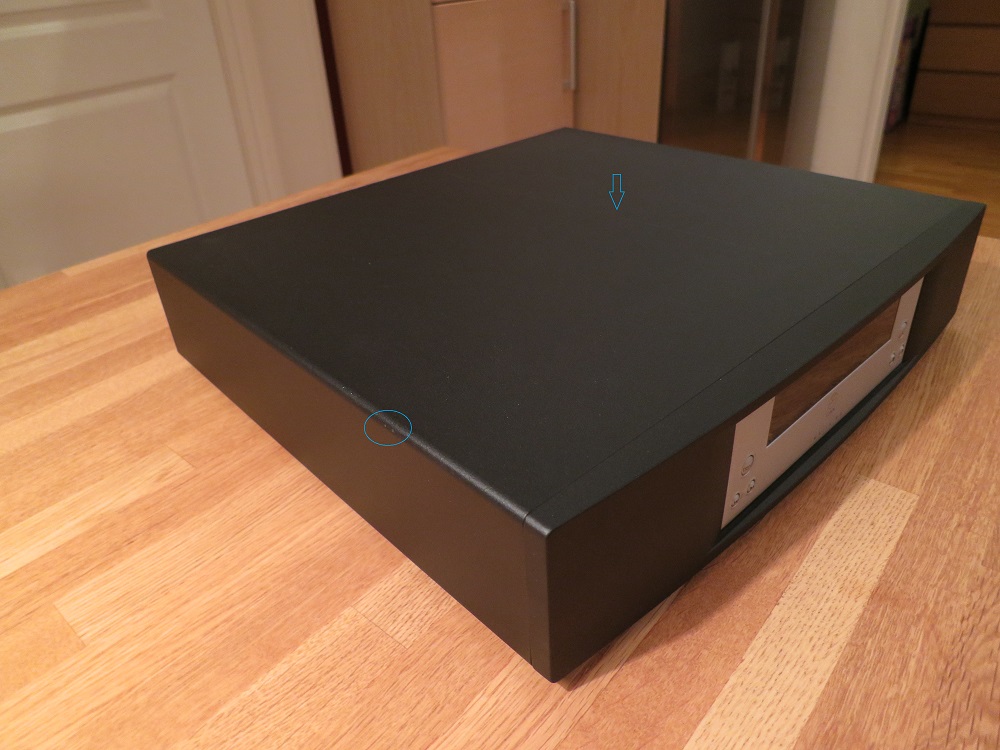 Litet märke på sidan av höljet samt repa ovanpå. Se bild.