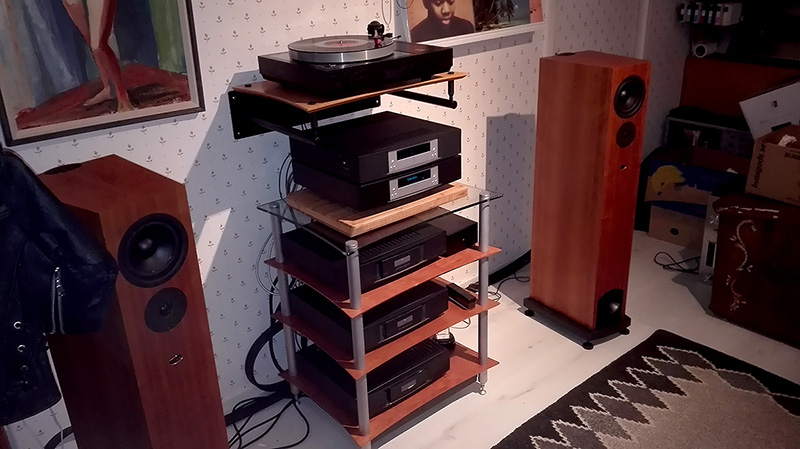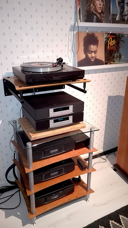 Det blev först ett 5125 som till en början fick ta hand om mellanregistret och diskanten medan LK240 stegen fick driva basarna. Kolektorn byttes mot en Kairn phono som senare fick ge vika för en Exotik +DA. Nåja i dags läget så drivs Espeken av 3 stycken 2250 aktivt, en Akurate DS har också fått plats på hyllan samt att Regan har blivit ersatt av en LP12.