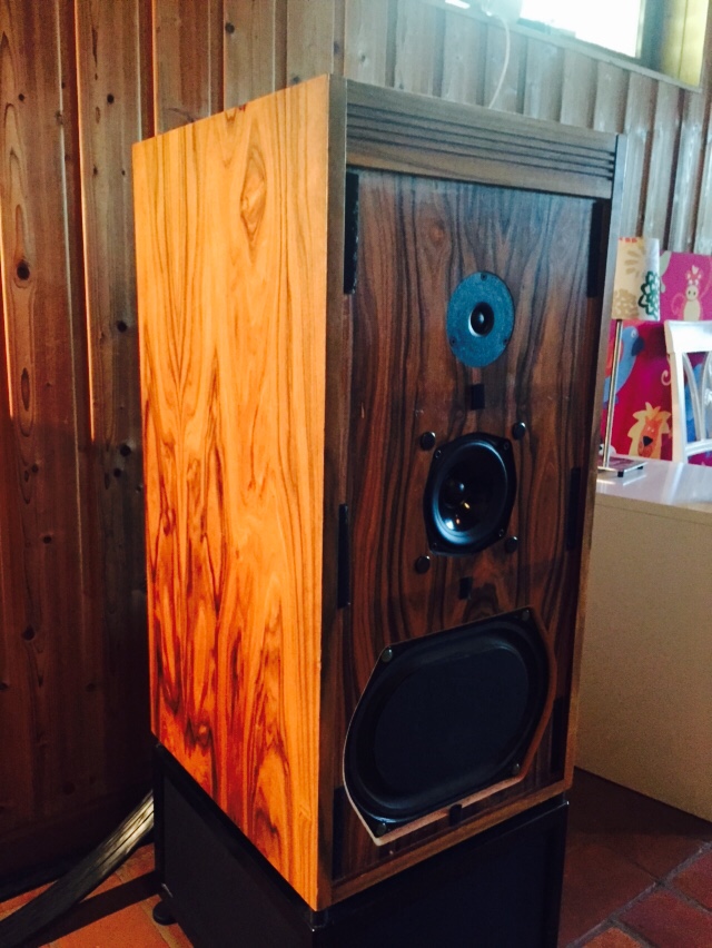 Ja, det är en smula overkill att köra Keltik som datorhögtalare, men vad gör man när kompisen inte har plats för ett par finfina Keltiklådor (han köpte högtalarna på bilden för att skörda fyra bas-element att ha som back-up för sina egna Keltik). Efter lite renoveringstid med byte av basar och diskanter och inköp av nya strumpor, är de som nya (detta par kommer från Xanlin i Linköping för övrigt). Eftersom jag bor i en tvåa och mitt vardagsrum redan pryds av ett par mycket vackra, mörkröda Keltik, fick jag möblera om sovrummet så att dessa klenoder fick plats.