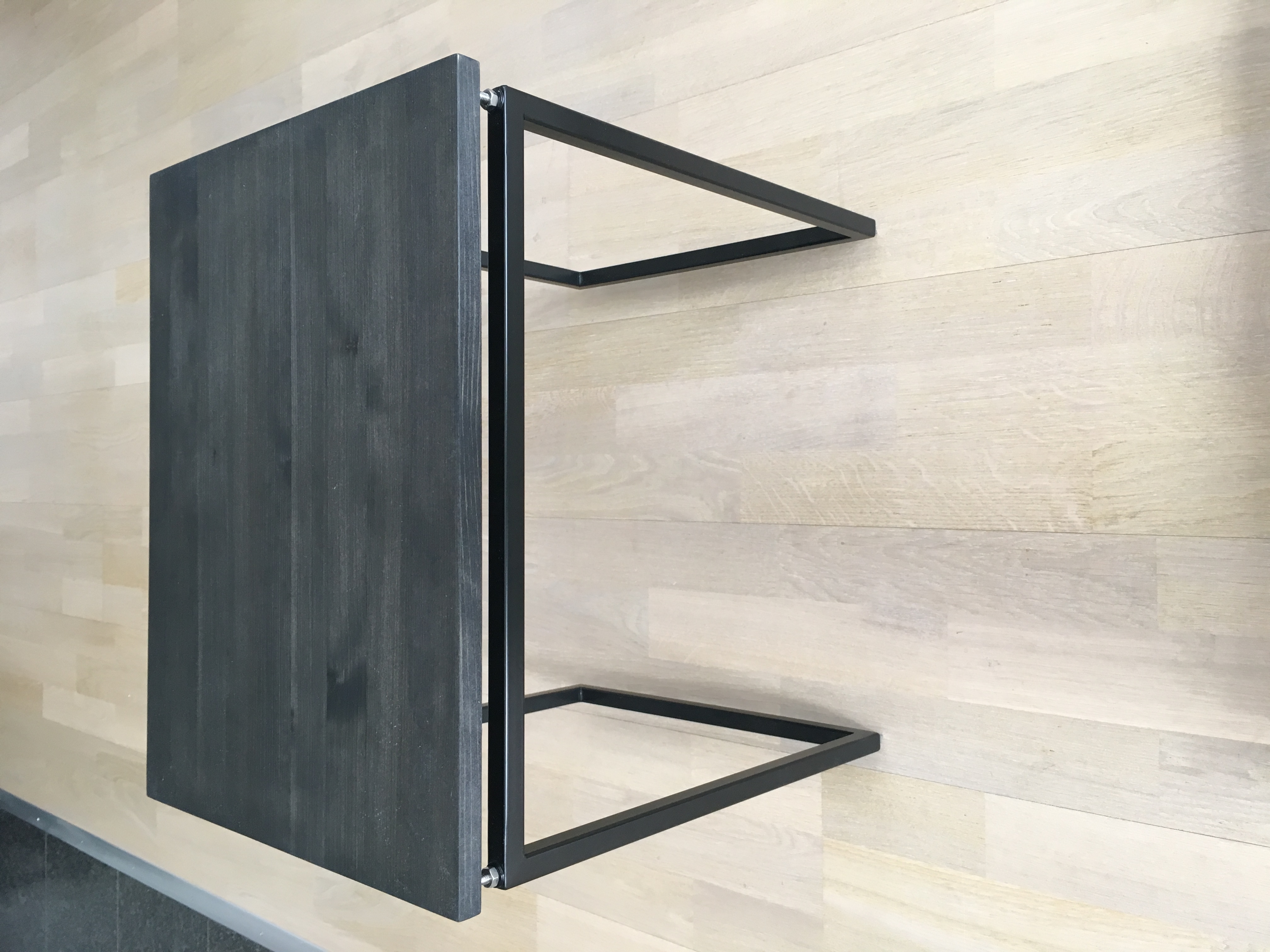 Stålramen är tillverkad för hand av en metallverkstad som sedan kör iväg ramen till lackeringsfirman för lack. Granskivan sätts (efter att trät legat och torkat några veckor) ihop stav för stav och limmas av en finsnickare som också kapar, hyvlar, slipar, betsar och oljar i flera lager. Bara i tillverkningen är det alltså tre andra företag inblandande som måste tjäna pengar på det de gör. Allt detta sker självklart i Sverige (i min närort), i väldigt små serier. Sen vill ju jag ha en liten slant över också, jag gör det ju inte enbart för att det är roligt :)