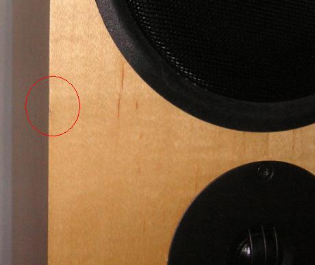 Jag har försökt fotografera märkena, men eftersom de är mycket små blir det inte så tydligt på bild. Jag har försökt få med ena kantmärket. Hörnbilden blev lite kass i blixten, men "skadan" kanske syns ändå? Det finns bilder på min medlemspresentation, där högtalarna är i sin nuvarande kondition. Ninkorna kan på begäran levereras i en av fyra olika konfigurationer, passiv singelwire, passiv biwire/biamp, aktiv biamp eller aktiv triamp. ;-)